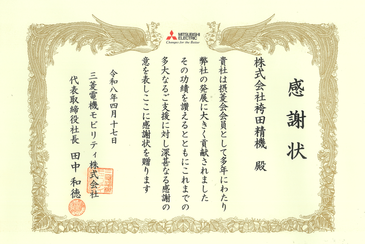 三菱電機モビリティ株式会社様より感謝状をいただきました